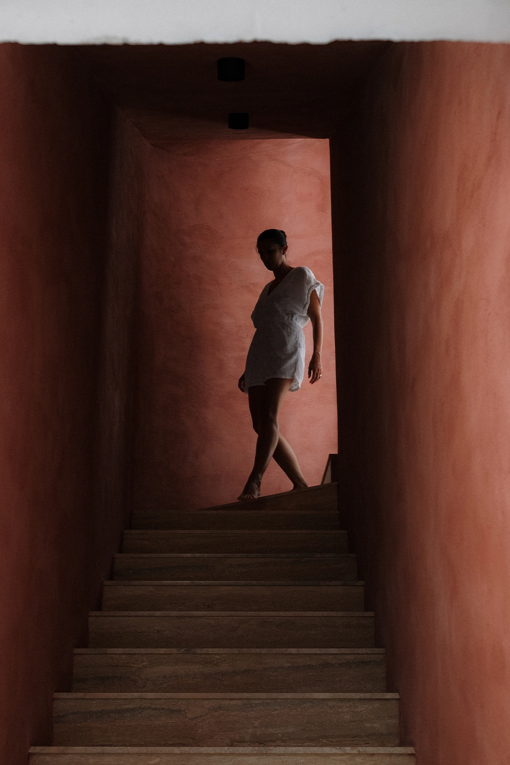 The defining intervention is a sculptural concrete staircase. More than a connector between floors, it links the two upper wings and serves as a bold architectural statement and frees previously used space in the courtyard. Its contemporary form deliberately contrasts with the traditional shell, highlighting the dialogue between past and present. Attention to detail was crucial where historic and new elements meet. Local stone, restored timber, and original masonry sit comfortably alongside plastered concrete, glass and clean finishes.