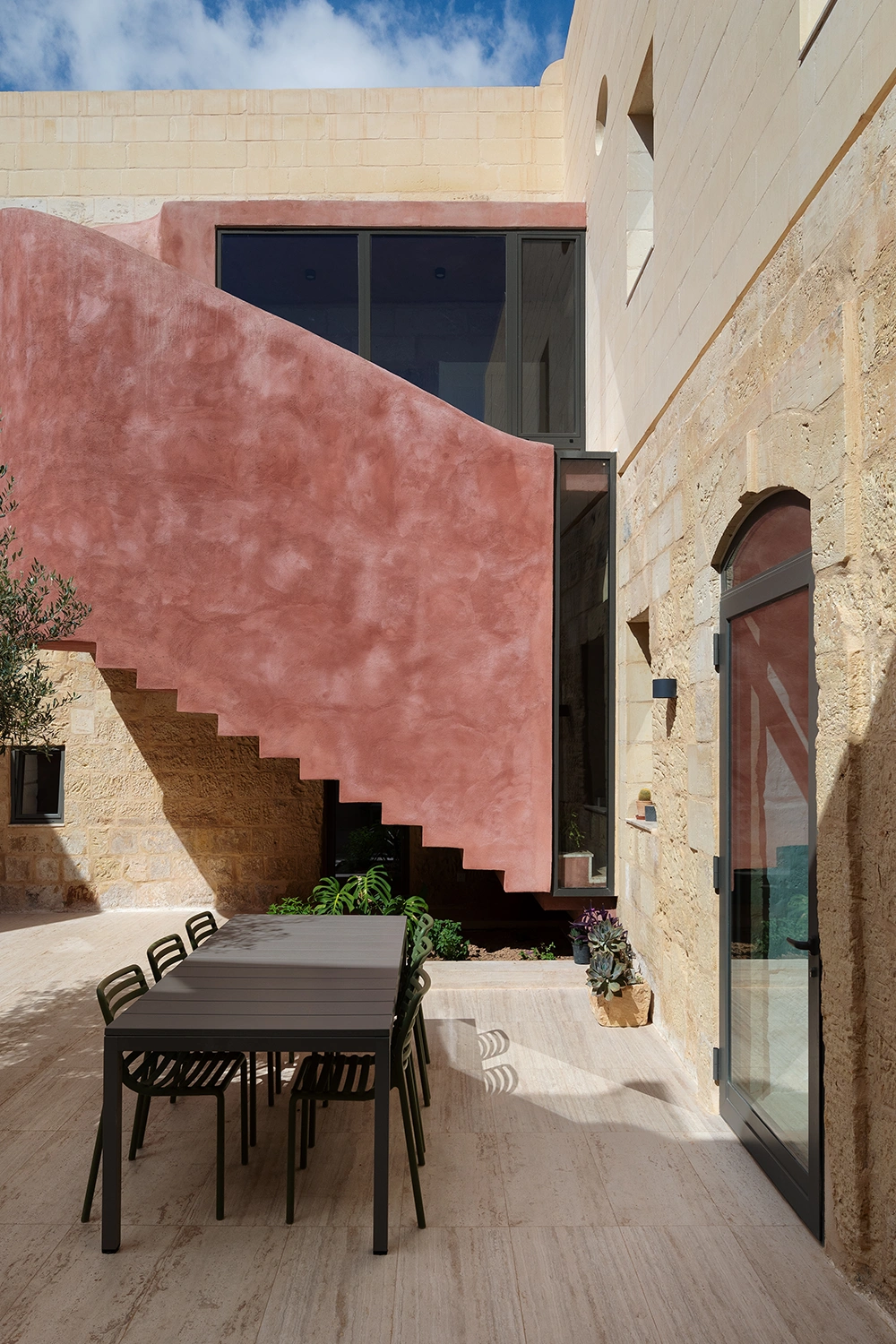 The re-imagined courtyard functions as a daily threshold, integrating outdoor space into everyday family routines. The staircase, encountered repeatedly throughout the day, becomes both a sculptural anchor and a lived experience. The family now enjoys a home that feels traditional yet practical, historic yet comfortable. Beyond the client, the project contributes to the wider conversation on conservation in Malta, demonstrating how vernacular properties can be revitalised for modern life while preserving their cultural significance. Energy-efficient upgrades improve comfort and reduce environmental impact, offering a model for sustainable adaptive reuse.