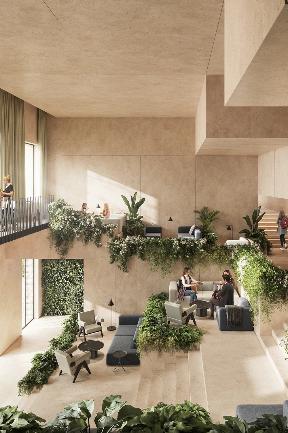 Evans building itself, will be externally restored with minimal interventions on some of its windows; elongating some of them will achieve more elegant proportions while improving internal views. The rear façade will be dressed with two, external corner elements, employed to house all building services and external fire escapes, while addressing various climatic challenges. This will ensure minimal intervention within the existing building, while drastically reducing runs of air-conditioning, fresh air and other services. Their aim is to integrate passive design solutions, such as natural ventilation and cooling; with active systems for energy generation and preservation while being detached from the historical envelope and mimic the ghost-like garden walls.