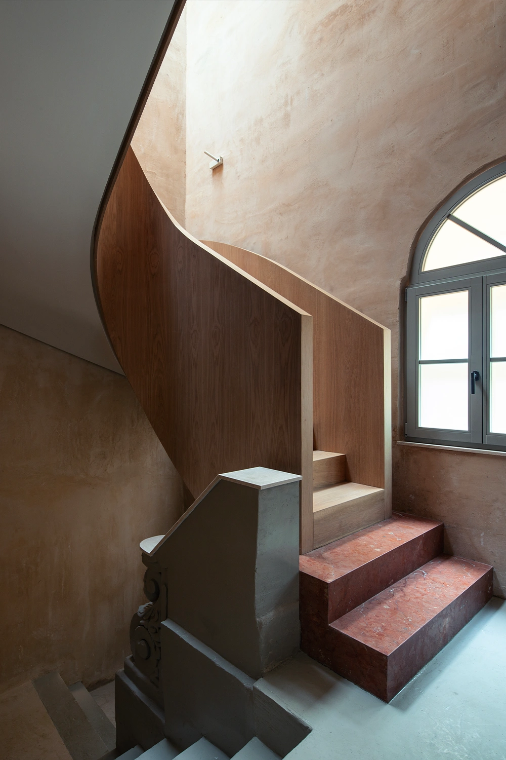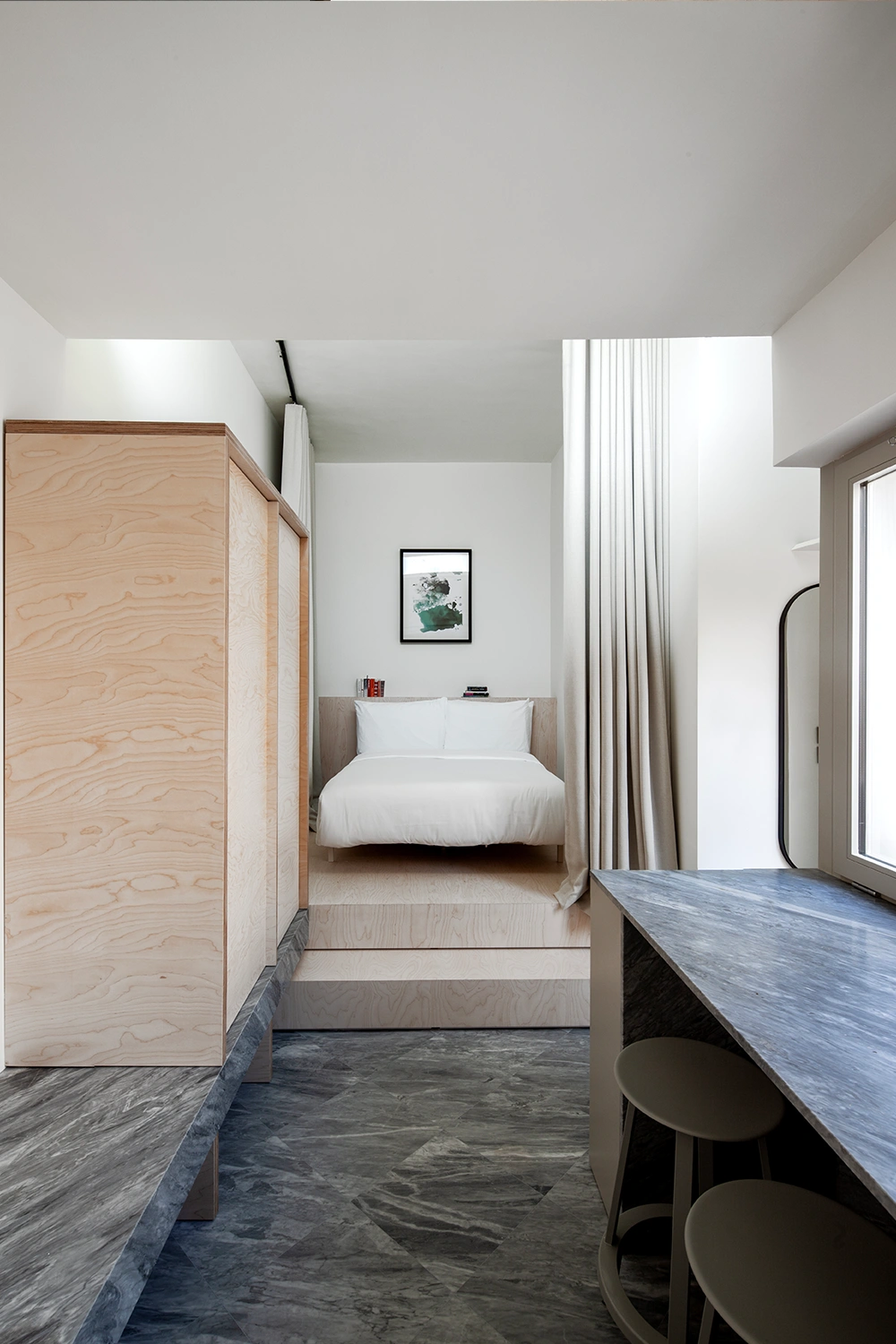 Interiors embrace texture and tactility. Restored timber beams, reused patterned tiles, and lime-washed walls sit in dialogue with contemporary insertions. Custom birch plywood furniture is paired with curated vintage pieces, while en-suite bathrooms are articulated through distinct marble palettes, lending each studio a quiet individuality.